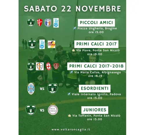 | PULCINI | 2012/2013 | 2 allenamenti settimanali + partita la domenica mattina | 16.30/18.00 | Mercoledì e Venerdì |